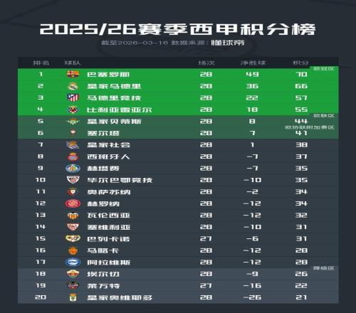 北京时间3月16日,西甲联赛第28轮的10场比赛有9场已经结束,本轮巴塞罗那、皇家马德里以及马德里竞技全部取胜。