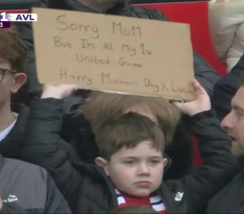 在转播镜头中,一名可爱的曼联小球迷在看台上举起一块硬纸板,写道:“对不起妈妈,但我今天是第一次现场看曼联的比赛。母亲节快乐,亲亲!卢卡(署名)。”