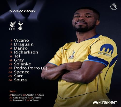 热刺首发:1-维卡里奥、3-德拉古辛、4-凯文-丹索、23-波罗、38-索萨、29-帕普-萨尔、14-阿奇-格雷、24-斯彭斯、11-马蒂斯-特尔、9-里沙利松、19-索兰克